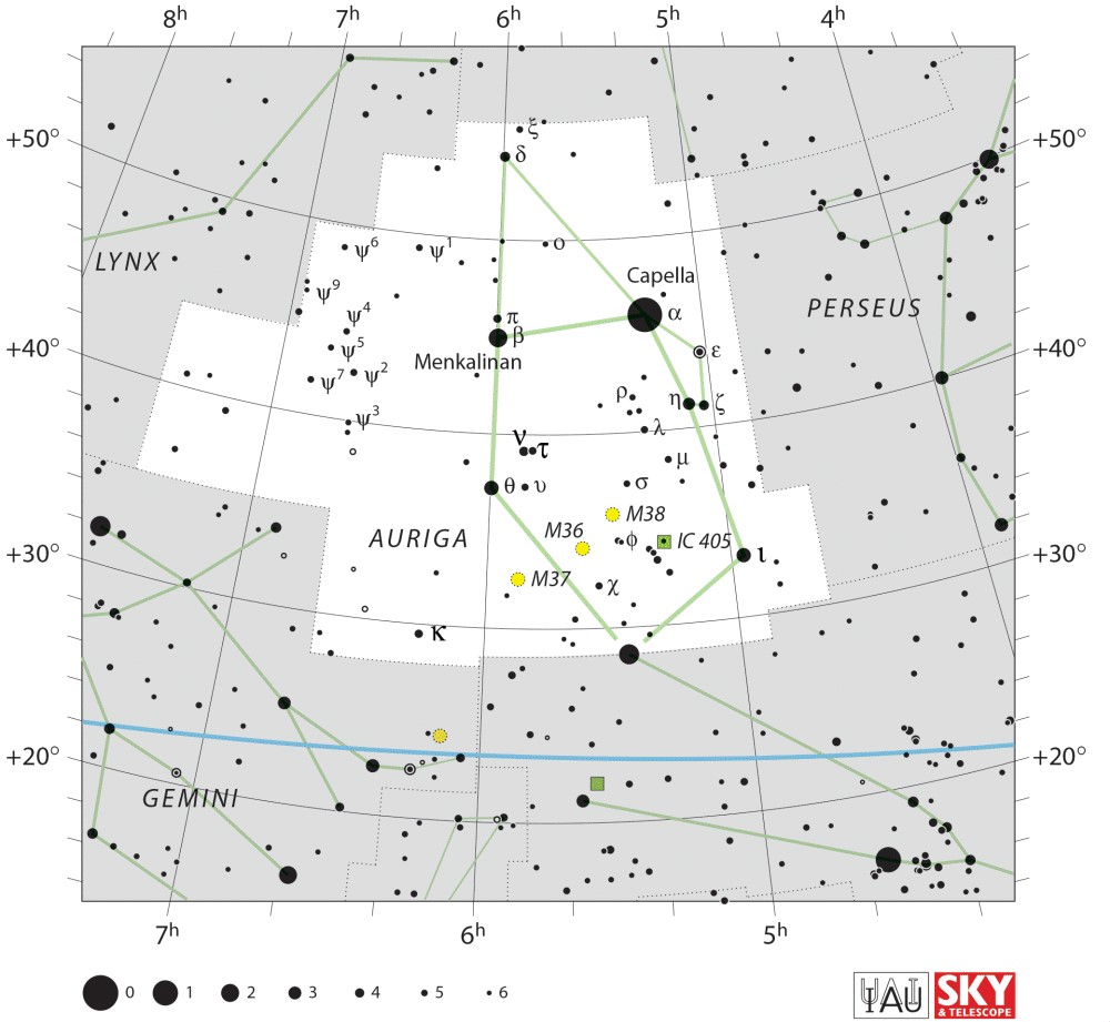 Auriga  Visible from latitudes 90° to -40° Optimum visibility January to April Celestial Quadrant  NQ2 | [Aur] | Auriga is one of the 88 modern constellations; it was among the 48 constellations listed by the 2nd-century astronomer Ptolemy. It is north of the celestial equator. Its name is Latin for '(the) charioteer', associating it with various mythological beings, including Erichthonius and Myrtilus. Auriga is most prominent during winter evenings in the northern Hemisphere, as are five other constellations that have stars in the Winter Hexagon asterism. Because of its northern declination, Auriga is only visible in its entirety as far south as -34°; for observers farther south it lies partially or fully below the horizon. A large constellation, with an area of 657 square degrees, it is half the size of the largest, Hydra. |  |