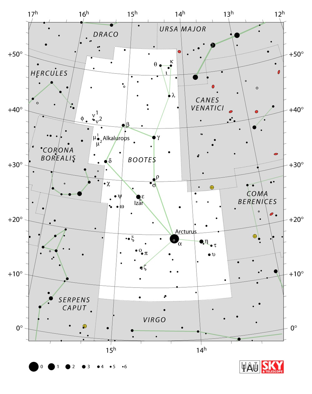 Bootes  Visible from latitudes 90° to -50° Optimum visibility April to July Celestial Quadrant  NQ3 | [Boo] | Bootes is a constellation in the northern sky, located between 0° and +60° declination, and 13 and 16 hours of right ascension on the celestial sphere. |  |