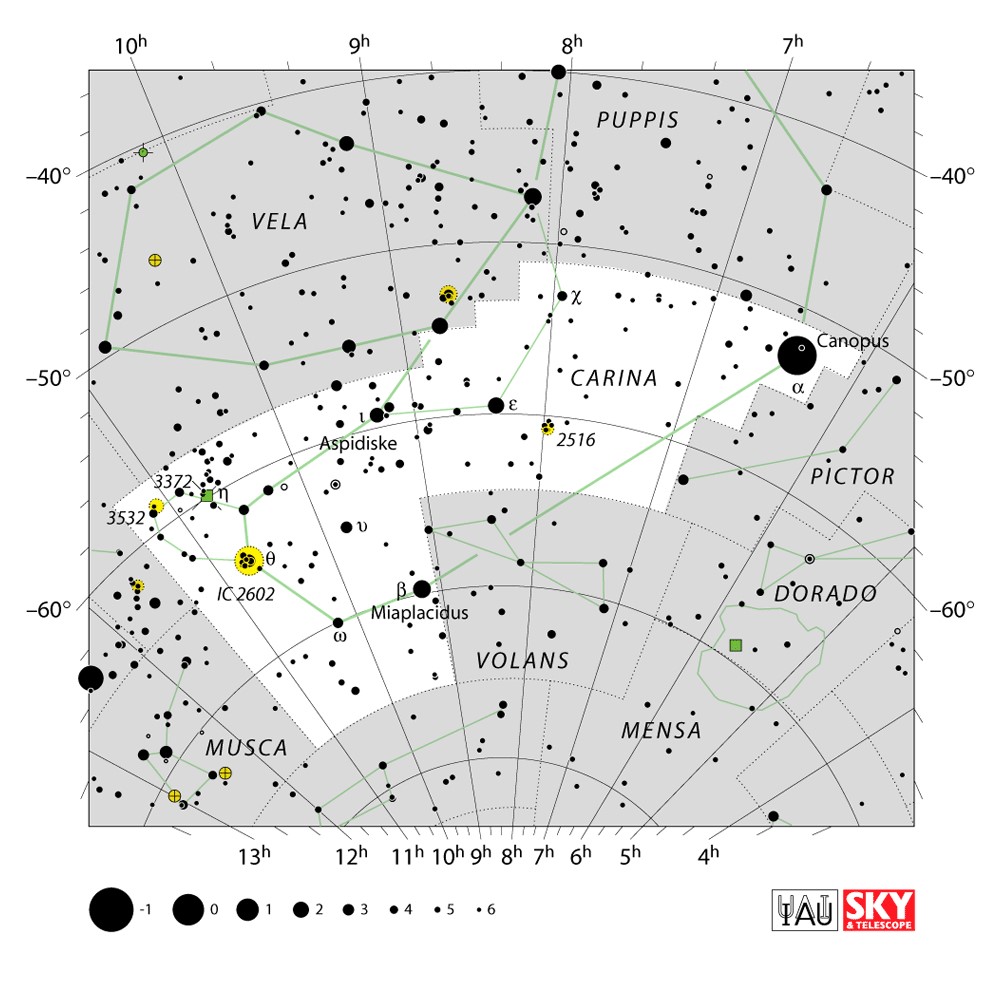 Carina  Visible from latitudes 20° to -90° Optimum visibility January to April Celestial Quadrant  SQ2 | [Car] | Carina is a constellation in the southern sky. Its name is Latin for the keel of a ship, and it was the southern foundation of the larger constellation of Argo Navis until it was divided into three pieces, the other two being Puppis, and Vela. |  |