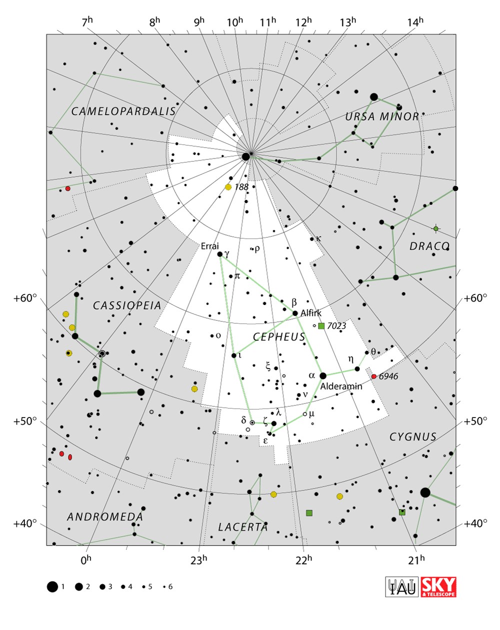 Cepheus  Visible from latitudes 90° to -10° Optimum visibility July to October Celestial Quadrant  NQ4 | [Cep] | Cepheus is a constellation in the northern sky, named after Cepheus, a king of Aethiopia in Greek mythology. It was one of the 48 constellations listed by the second century astronomer Ptolemy, and it remains one of the 88 constellations in the modern times. |  |