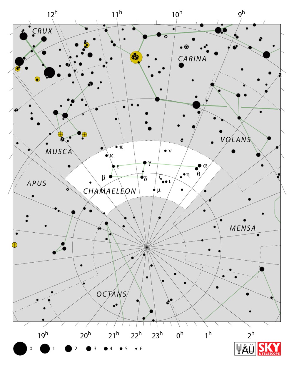 Chamaeleon  Visible from latitudes 0° to -90° Optimum visibility January to April Celestial Quadrant  SQ2 | [Cha] | Chamaeleon is a small constellation in the southern sky. It is named after the chameleon, a kind of lizard. It was first defined in the 16th century. |  |