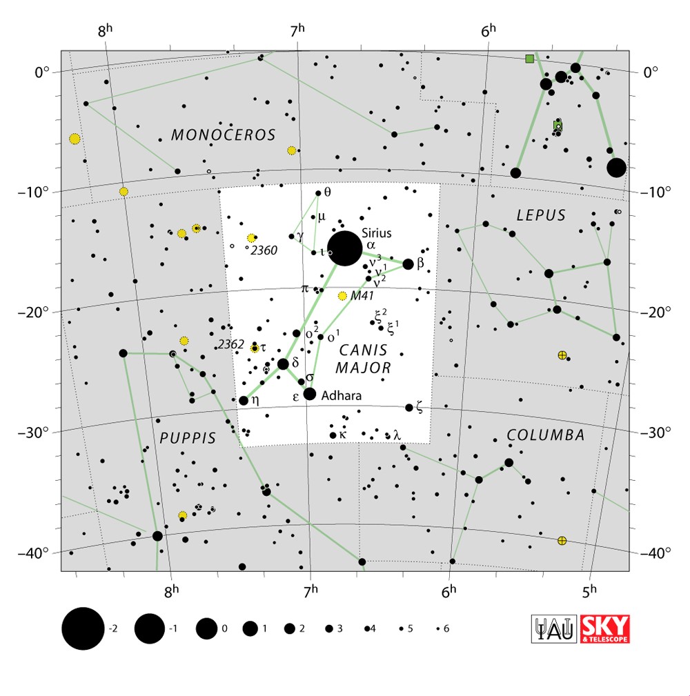Canis Major  Visible from latitudes 60° to -90° Optimum visibility January to April Celestial Quadrant  SQ2 | [CMa] | Canis Major is a constellation in the southern celestial hemisphere. In the second century, it was included in Ptolemy's 48 constellations, and is counted among the 88 modern constellations. Its name is Latin for "greater dog" in contrast to Canis Minor, the "lesser dog"; both figures are commonly represented as following the constellation of Orion the hunter through the sky. The Milky Way passes through Canis Major and several open clusters lie within its borders, most notably M41. |  |