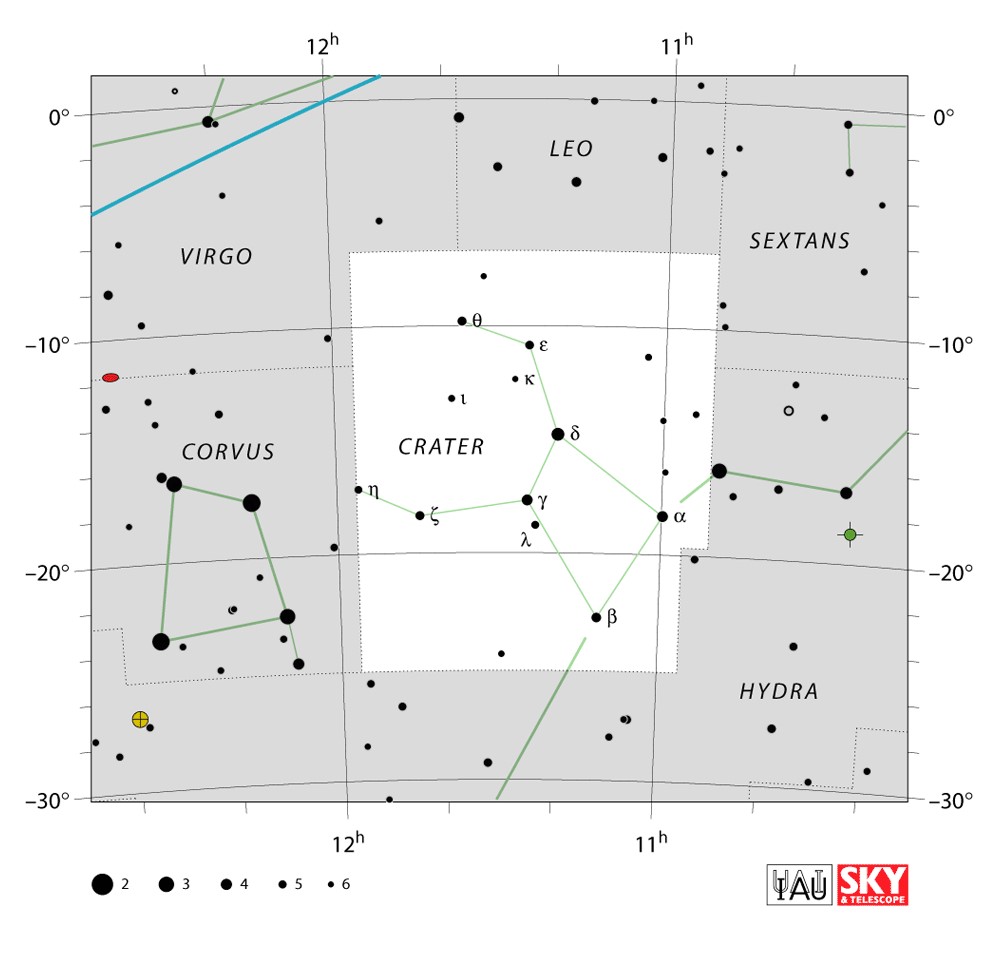 Crater  Visible from latitudes 65° to -90° Optimum visibility January to April Celestial Quadrant  SQ2 | [Crt] | Crater is a small constellation in the southern celestial hemisphere. Its name is the latinization of the Greek krater, a type of cup used to water down wine. One of the 48 constellations listed by the second-century astronomer Ptolemy, it depicts a cup that has been associated with the god Apollo and is perched on the back of Hydra the water snake. |  |