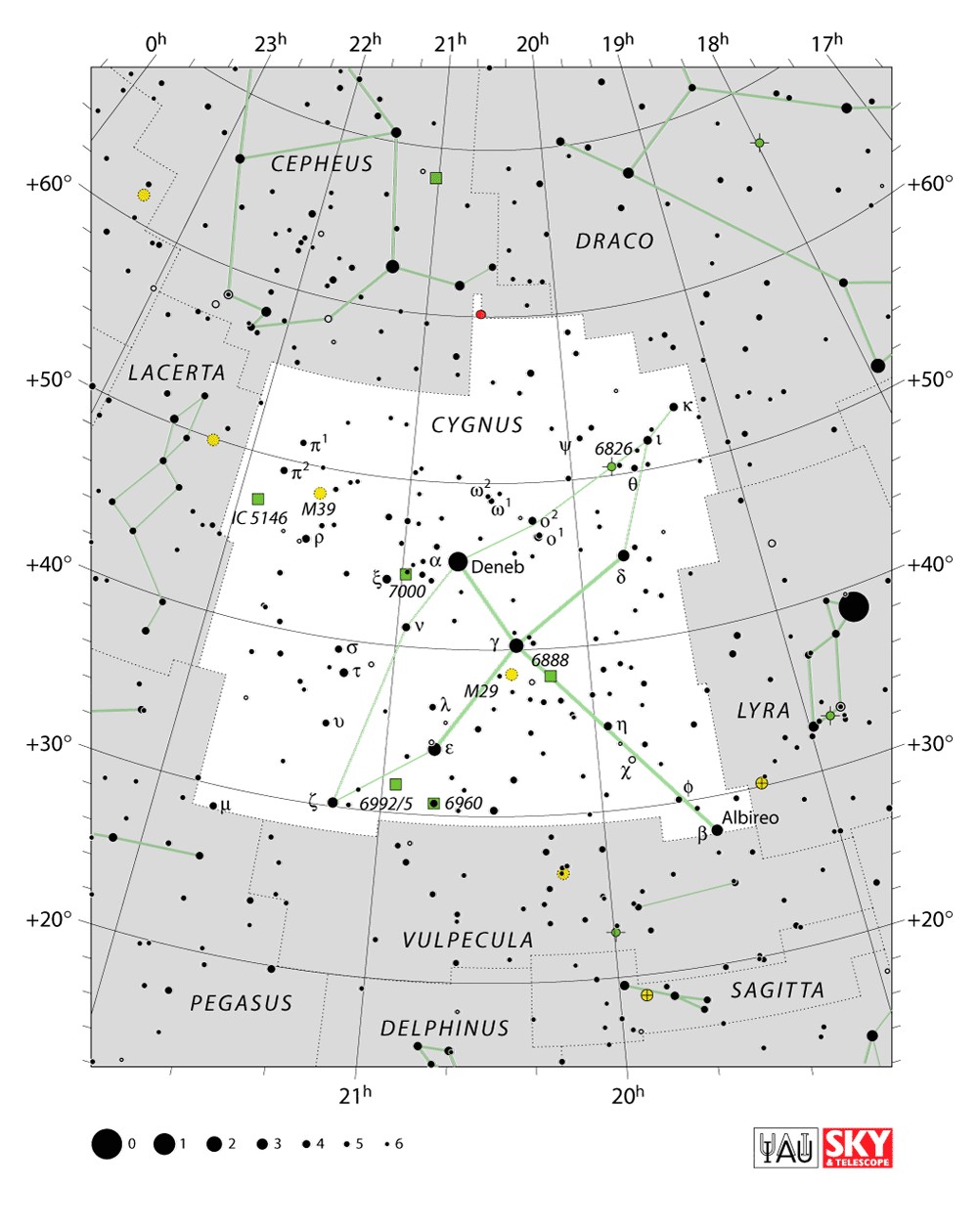 Cygnus  Visible from latitudes 90° to -40° Optimum visibility July to October Celestial Quadrant  NQ4 | [Cyg] | Cygnus is a northern constellation on the plane of the Milky Way, deriving its name from the Latinized Greek word for swan. Cygnus is one of the most recognizable constellations of the northern summer and autumn, and it features a prominent asterism known as the Northern Cross. Cygnus was among the 48 constellations listed by the 2nd century astronomer Ptolemy, and it remains one of the 88 modern constellations. |  |
