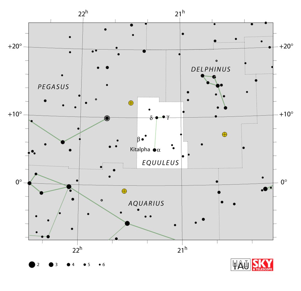 Equuleus  Visible from latitudes 90° to -70° Optimum visibility July to October Celestial Quadrant  NQ4 | [Equ] | Equuleus is a constellation of stars that are visible in the night sky. Its name is Latin for "little horse", a foal. Located on the northern celestial hemisphere, it was one of the 48 constellations listed by the 2nd century astronomer Ptolemy, and remains one of the 88 modern constellations. It is the second smallest of the modern constellations, spanning only 72 square degrees. It is also very faint, having no stars brighter than the fourth magnitude. |  |