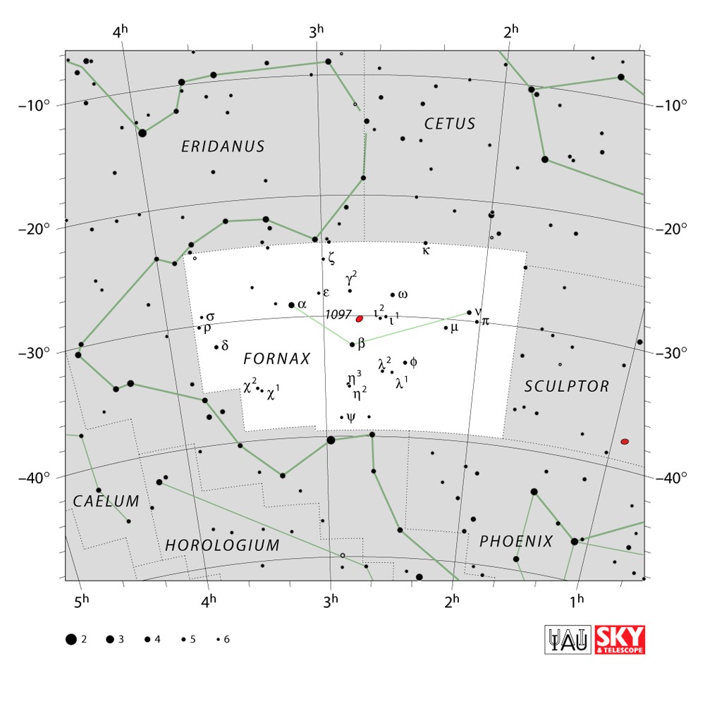 Fornax  Visible from latitudes 50° to -90° Optimum visibility October to January Celestial Quadrant  SQ1 | [For] | Fornax is a constellation in the southern celestial hemisphere, partly ringed by the celestial river Eridanus. Its name is Latin for furnace. It was named by French astronomer Nicolas Louis de Lacaille in 1756. Fornax is one of the 88 modern constellations. |  |