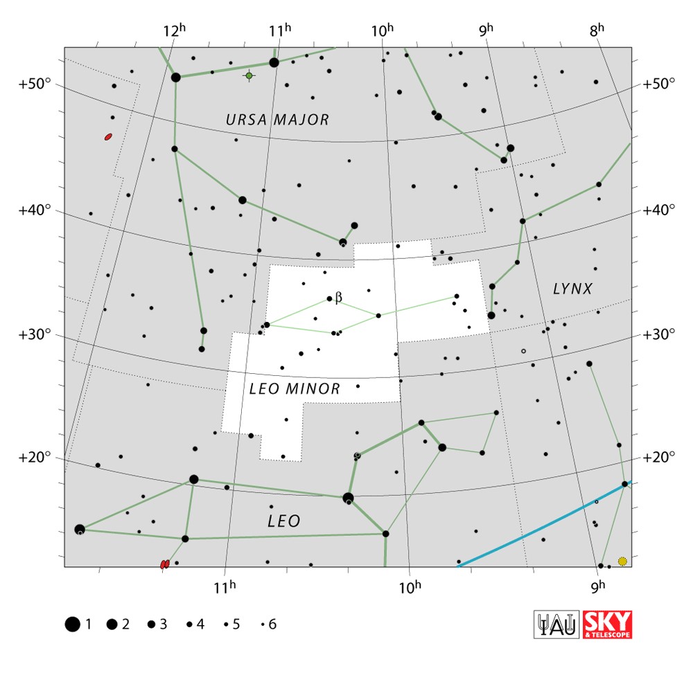 Leo Minor  Visible from latitudes 90° to -45° Optimum visibility January to April Celestial Quadrant  NQ2 | [LMi] | Leo Minor is a small and faint constellation in the northern celestial hemisphere. Its name is Latin for "the smaller lion", in contrast to Leo, the larger lion. It lies between the larger and more recognizable Ursa Major to the north and Leo to the south. Leo Minor was not regarded as a separate constellation by classical astronomers; it was designated by Johannes Hevelius in 1687. |  |