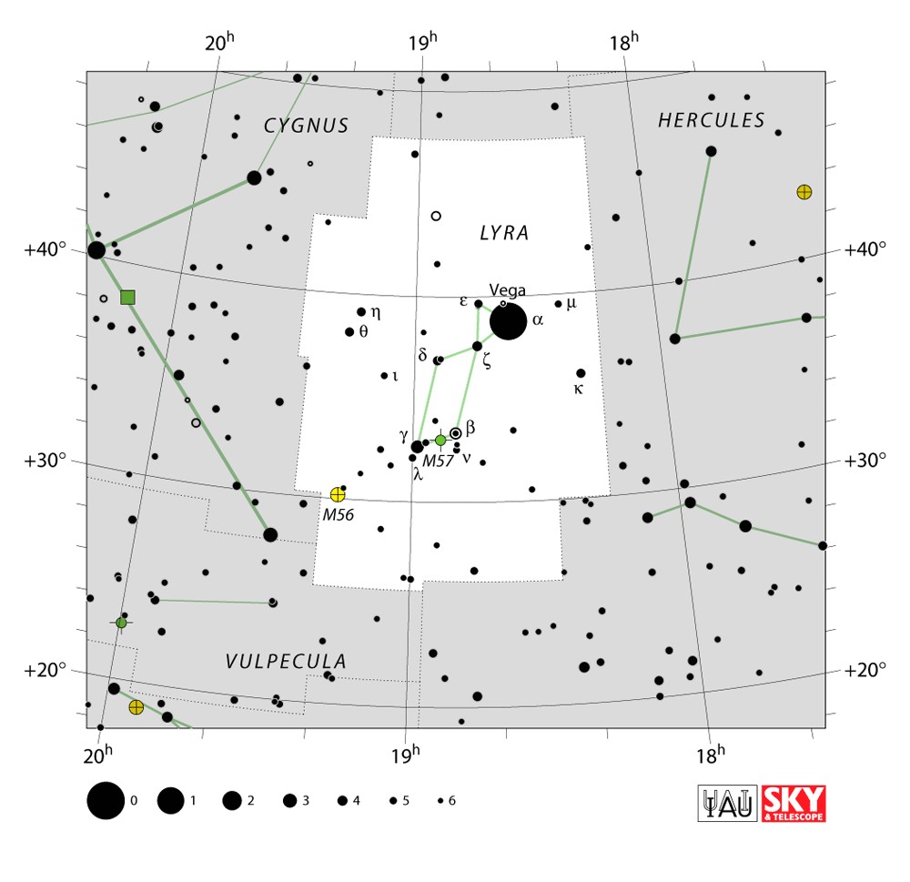 Lyra  Visible from latitudes 90° to -40° Optimum visibility July to October Celestial Quadrant  NQ4 | [Lyr] | Lyra is a small constellation. It is one of the 48 listed by the 2nd century astronomer Ptolemy, and is one of the modern 88 constellations recognized by the International Astronomical Union. Lyra was often represented on star maps as a vulture or an eagle carrying a lyre, and hence is sometimes referred to as Vultur Cadens or Aquila Cadens, respectively. Beginning at the north, Lyra is bordered by Draco, Hercules, Vulpecula, and Cygnus. Lyra is nearly overhead in temperate northern latitudes shortly after midnight at the start of summer. From the equator to about the 40th parallel south it is visible low in the northern sky during the same months. |  |