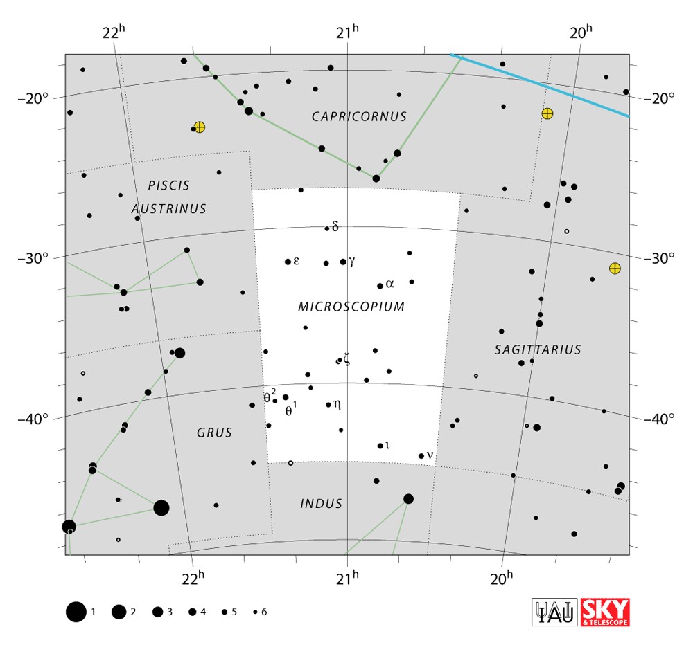 Microscopium  Visible from latitudes 45° to -90° Optimum visibility July to October Celestial Quadrant  SQ4 | [Mic] | Microscopium is a minor constellation in the southern celestial hemisphere, one of twelve created in the 18th century by French astronomer Nicolas-Louis de Lacaille and one of several depicting scientific instruments. The name is a Latinised form of the Greek word for microscope. Its stars are faint and hardly visible from most of the non-tropical Northern Hemisphere. |  |