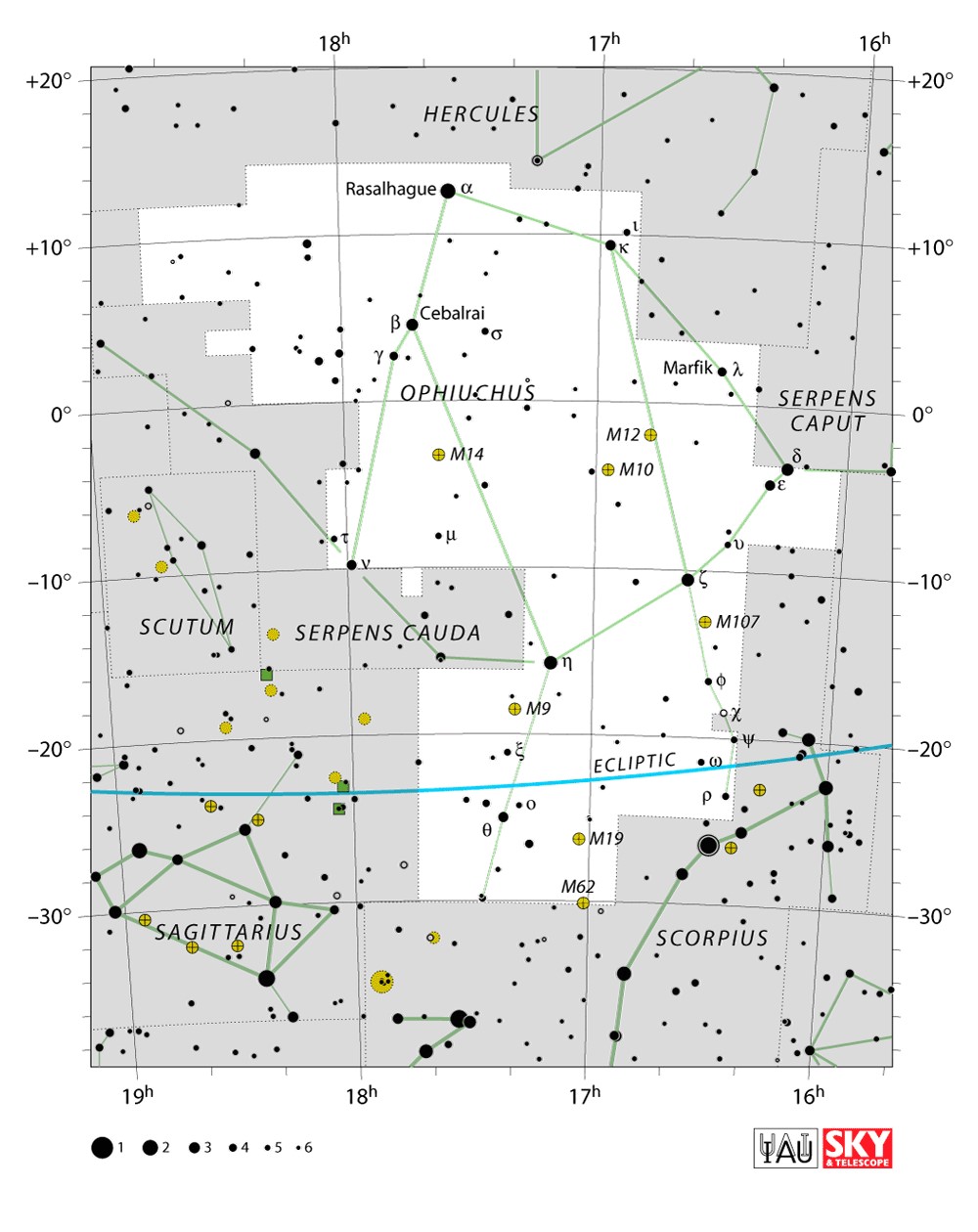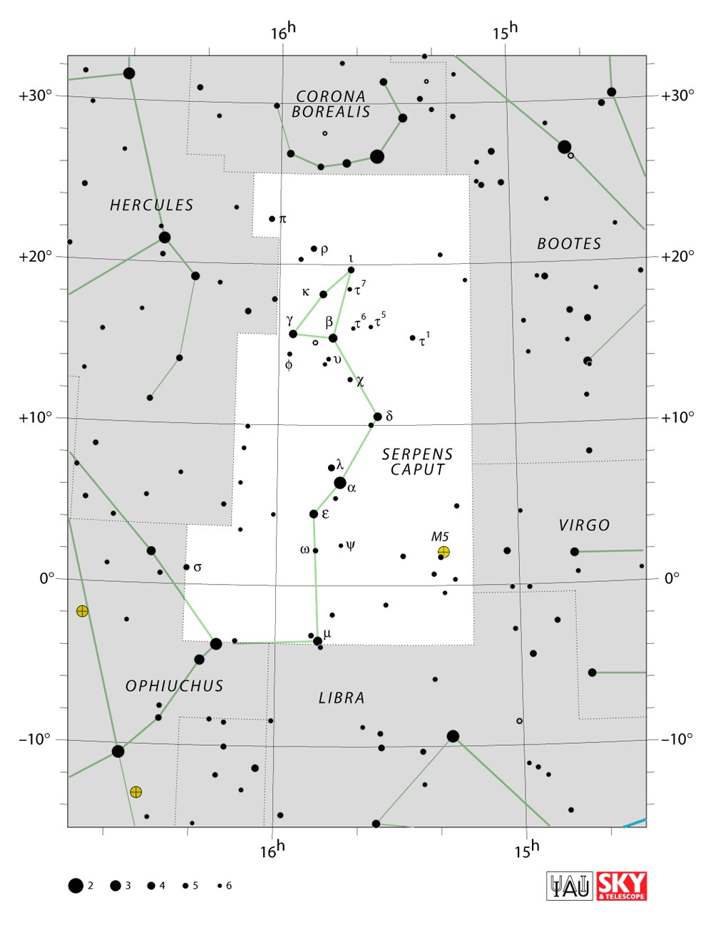 Serpens  Visible from latitudes 80° to -80° Optimum visibility April to July Celestial Quadrant  NQ3 & SQ3 | [Ser] | Serpens is unique among the modern constellations in being split into two non-contiguous parts, Serpens Caput to the west and Serpens Cauda to the east. Between these two halves lies the constellation of Ophiuchus, the "Serpent-Bearer". In figurative representations, the body of the serpent is represented as passing behind Ophiuchus between Mu Serpentis in Serpens Caput and Nu Serpentis in Serpens Cauda.