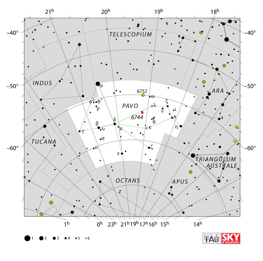 Pavo  Visible from latitudes 15° to -90° Optimum visibility July to October Celestial Quadrant  SQ4 | [Pav] | Pavo is a constellation in the southern sky whose name is Latin for "peacock". Pavo first appeared on a 35-cm (14in) diameter celestial globe published in 1598 in Amsterdam by Plancius and Jodocus Hondius and was depicted in Johann Bayer's star atlas Uranometria of 1603, and was likely conceived by Petrus Plancius from the observations of Pieter Dirkszoon Keyser and Frederick de Houtman. French explorer and astronomer Nicolas-Louis de Lacaille gave its stars Bayer designations in 1756. The constellations Pavo, Grus, Phoenix and Tucana are collectively known as the "Southern Birds". |  |