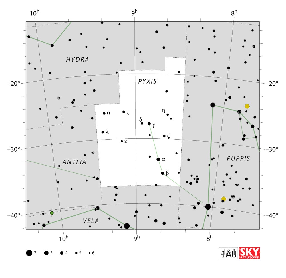 Pyxis  Visible from latitudes 50° to -90° Optimum visibility January to April Celestial Quadrant  SQ2 | [Pyx] | Pyxis is a small and faint constellation in the southern sky. Abbreviated from Pyxis Nautica, its name is Latin for a mariner's compass. Pyxis was introduced by Nicolas-Louis de Lacaille in the 18th century, and is counted among the 88 modern constellations. |  |