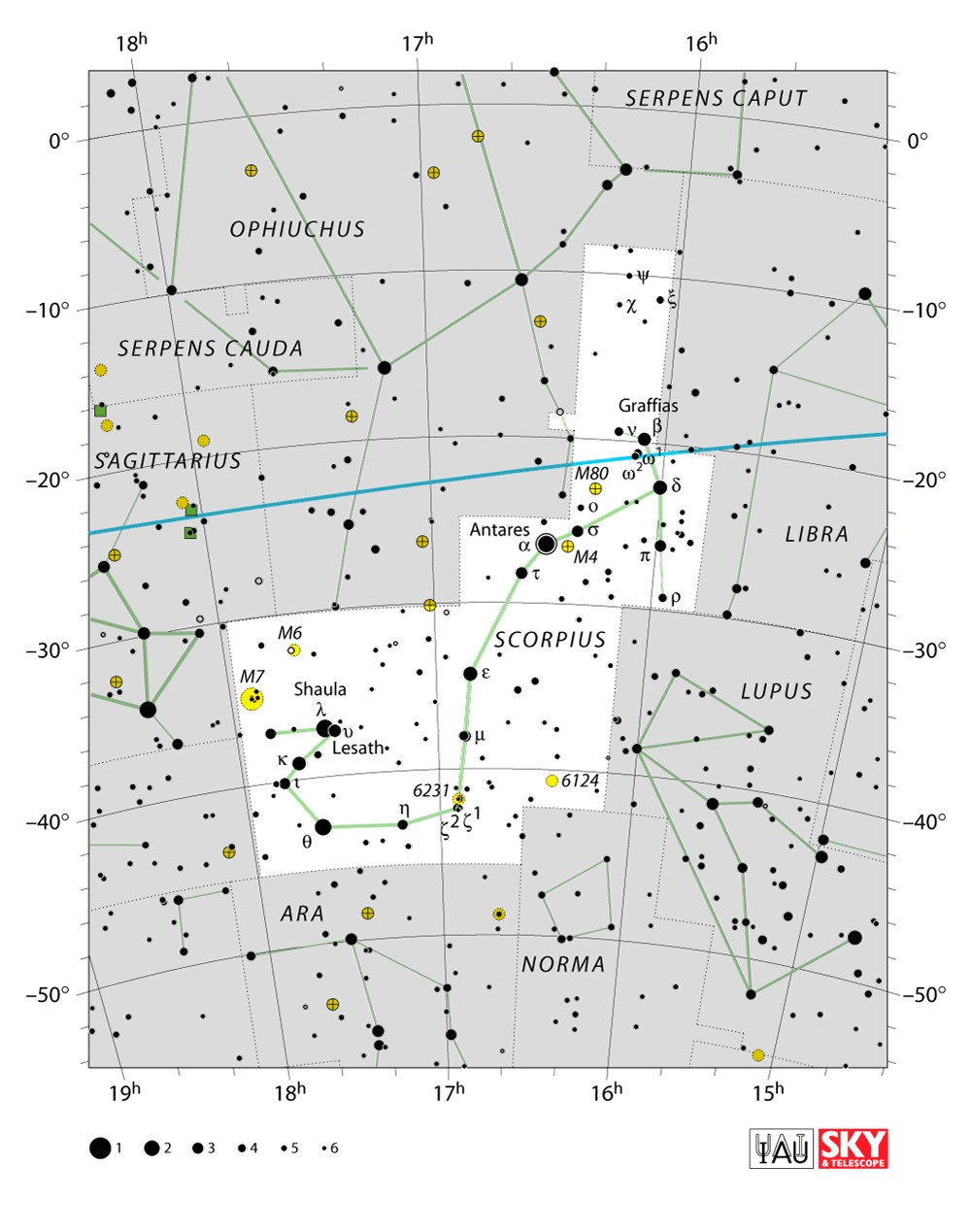 Scorpius  Visible from latitudes 40° to -90° Optimum visibility April to July Celestial Quadrant  SQ3 | [Sco] | Scorpius is one of the constellations of the zodiac and is located in the Southern celestial hemisphere. Scorpius is one of the 48 constellations identified by the Greek astronomer Ptolemy in the second century. It is an ancient constellation that pre-dates the Greeks. It lies between Libra to the west and Sagittarius to the east. It is a large constellation located in the southern hemisphere near the center of the Milky Way. |  |