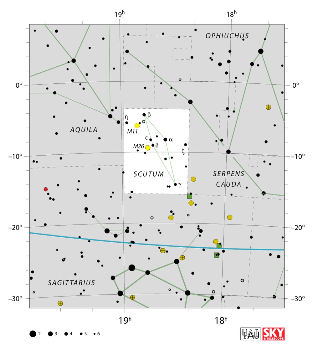 Scutum  Visible from latitudes 70° to -90° Optimum visibility July to October Celestial Quadrant  SQ4 | [Sct] | Scutum is a small constellation. Its name is Latin for shield, and it was originally named Scutum Sobiescianum by Johannes Hevelius in 1684. It lies entirely in the southern celestial hemisphere and its four brightest stars form a narrow diamond shape. It is one of the 88 IAU designated constellations defined in 1922. |  |