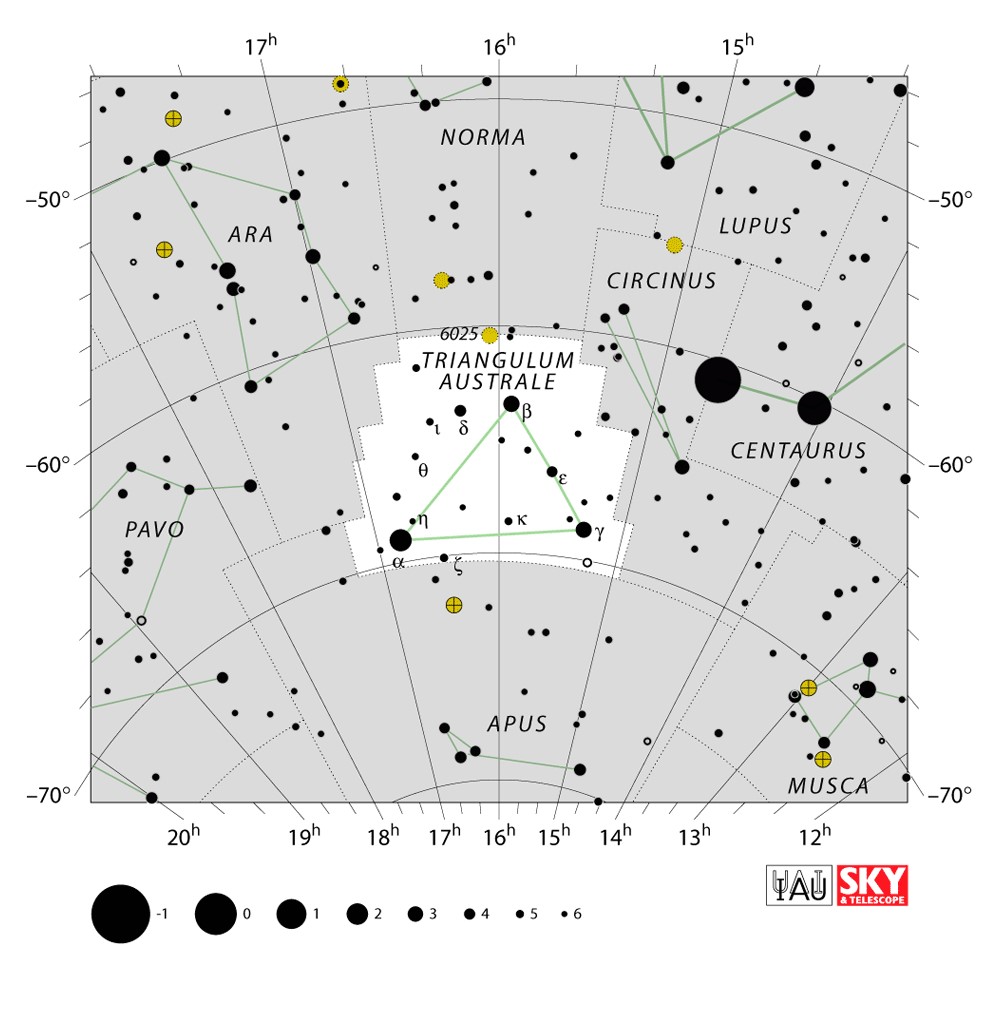 Triangulum Australe  Visible from latitudes 15° to -90° Optimum visibility April to July Celestial Quadrant  SQ3 | [TrA] | Triangulum Australe is a small constellation in the far Southern Celestial Hemisphere. Its name is Latin for "the southern triangle", which distinguishes it from Triangulum in the northern sky and is derived from the acute, almost equilateral pattern of its three brightest stars. It was first depicted on a celestial globe as Triangulus Antarcticus by Petrus Plancius in 1589, and later with more accuracy and its current name by Johann Bayer in his 1603 Uranometria. The French explorer and astronomer Nicolas Louis de Lacaille charted and gave the brighter stars their Bayer designations in 1756. |  |