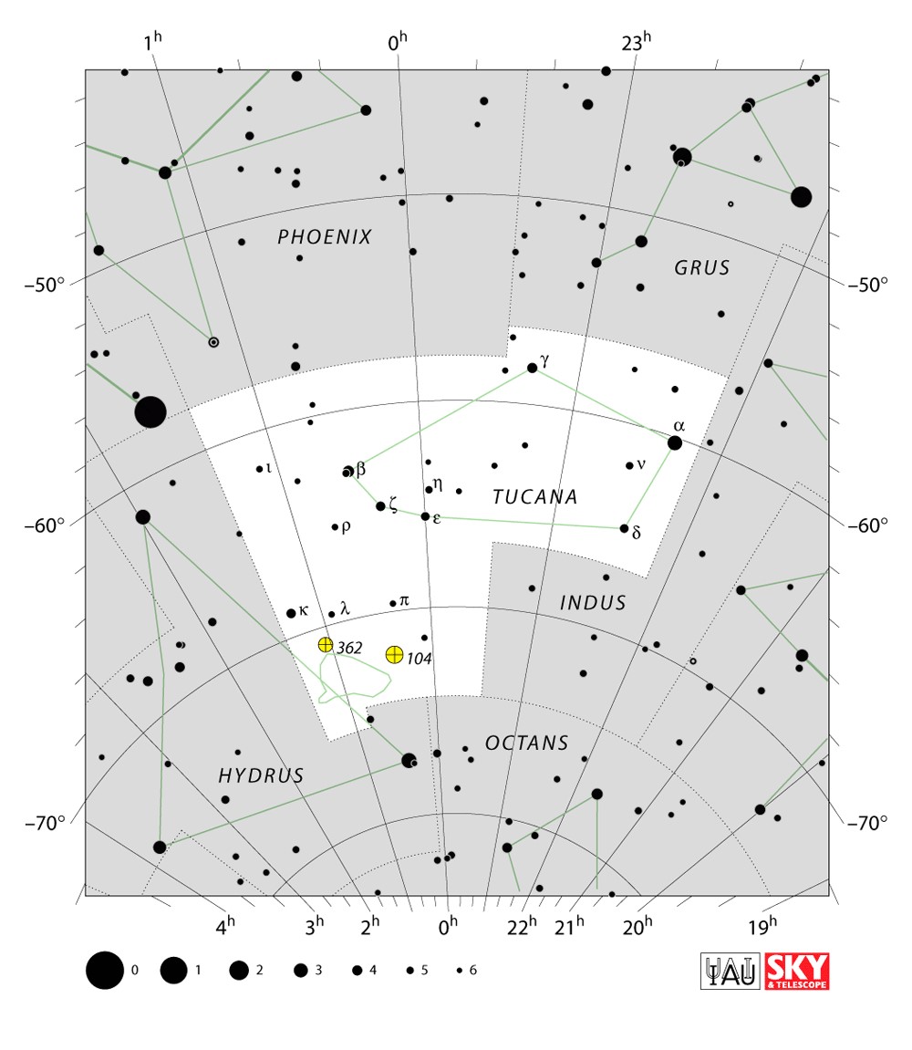 Tucana  Visible from latitudes 15° to -90° Optimum visibility July to October Celestial Quadrant  SQ4 | [Tuc] | Tucana is a constellation of stars in the southern sky, named after the toucan, a South American bird. It is one of twelve constellations conceived in the late sixteenth century by Petrus Plancius from the observations of Pieter Dirkszoon Keyser and Frederick de Houtman. Tucana first appeared on a 35-centimetre-diameter (14in) celestial globe published in 1598 in Amsterdam by Plancius and Jodocus Hondius and was depicted in Johann Bayer's star atlas Uranometria of 1603. French explorer and astronomer Nicolas Louis de Lacaille gave its stars Bayer designations in 1756. The constellations Tucana, Grus, Phoenix and Pavo are collectively known as the "Southern Birds". |  |