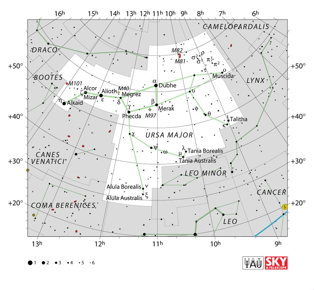 Ursa Major  Visible from latitudes 90° to -30° Optimum visibility January to April Celestial Quadrant  NQ2 | [UMa] | Ursa Major is a constellation in the northern sky, whose associated mythology likely dates back into prehistory. Its Latin name means "greater she-bear," referring to and contrasting it with nearby Ursa Minor, the lesser bear. In antiquity, it was one of the original 48 constellations listed by Ptolemy in the 2nd century AD. Today it is the third largest of the 88 modern constellations. |  |