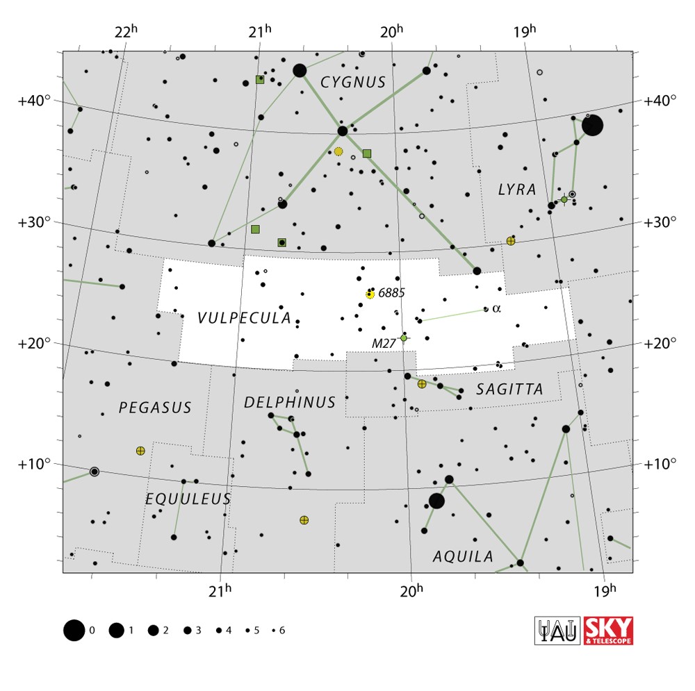 Vulpecula  Visible from latitudes 90° to -55° Optimum visibility July to October Celestial Quadrant  NQ4 | [Vul] | Vulpecula is a faint constellation in the northern sky. Its name is Latin for "little fox", although it is commonly known simply as the fox. It was identified in the seventeenth century, and is located in the middle of the Summer Triangle. |  |